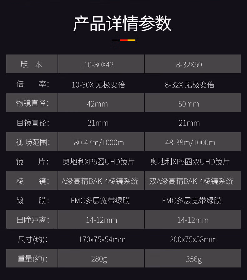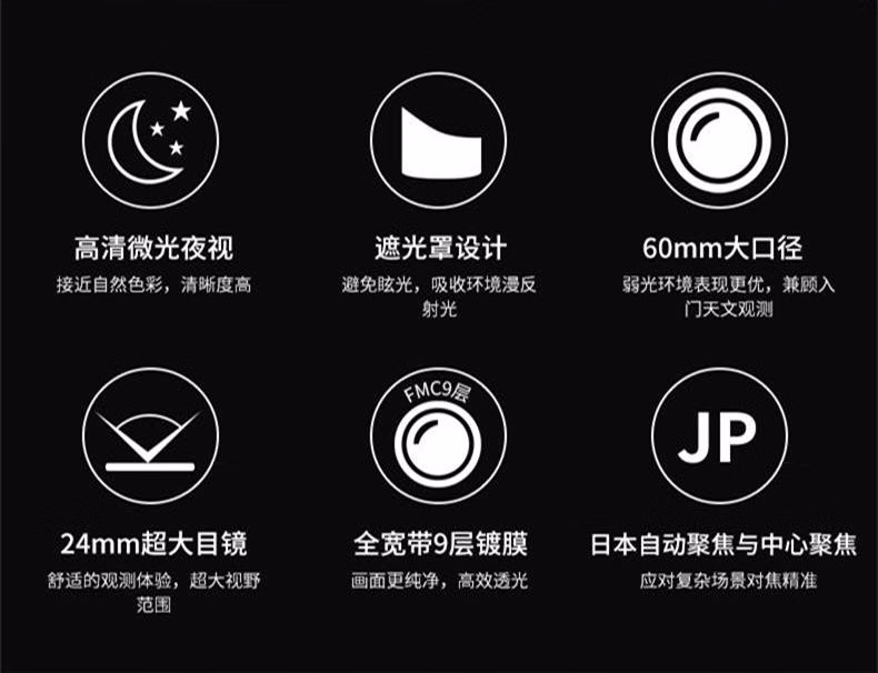望远镜X1、擦镜布X1、尼龙包X1、说明书X1、保修卡X1
